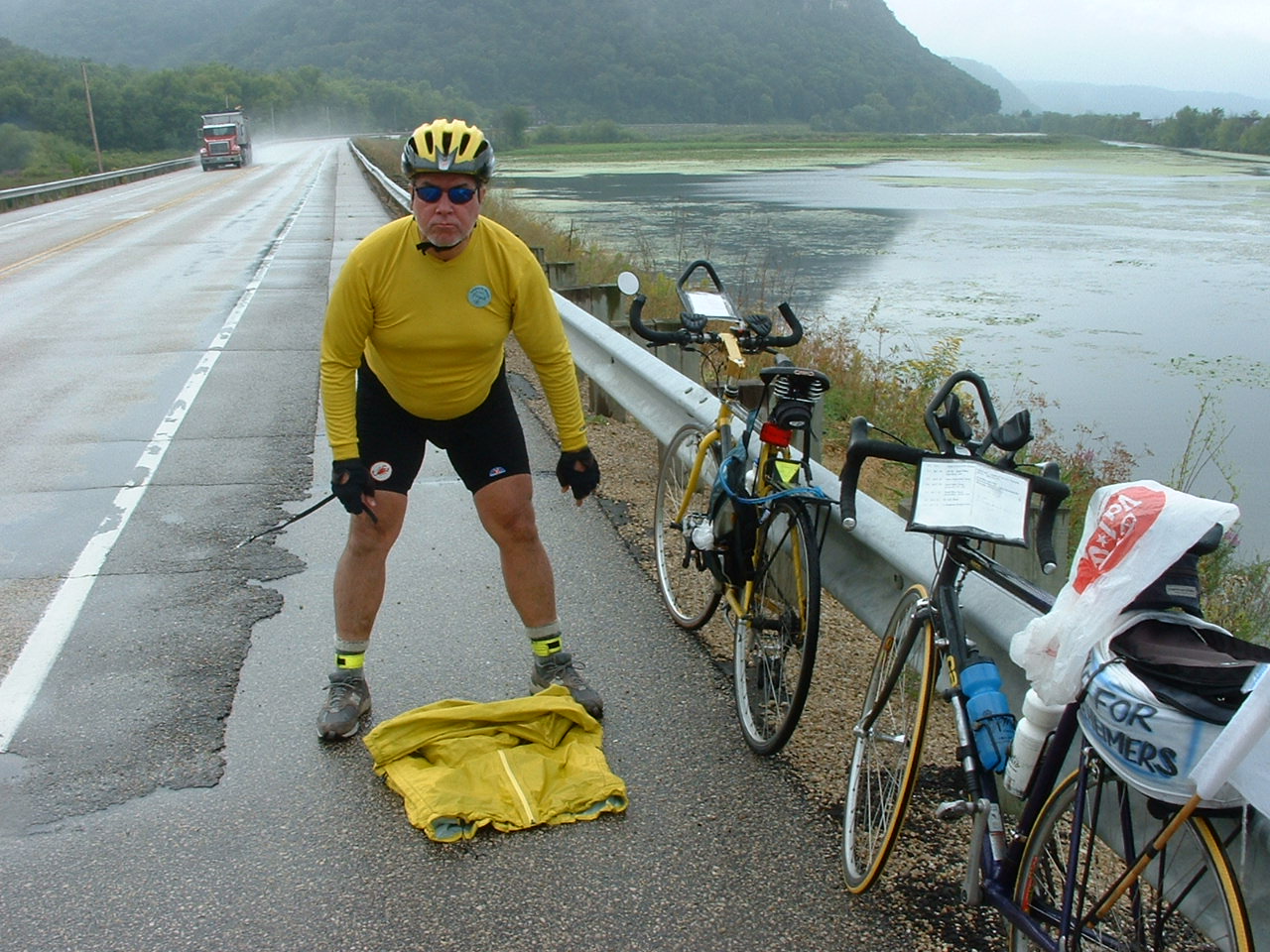 The SAG was at 31 miles and this pic is of me signing in. All cyclists must sign in at all SAG stops so ABB knows where we are and can keep track of us. Ten minutes after we left the SAG it started to rain so we stopped to put on our rain gear. I also needed to put a plastic cover over my bike bag. It continued to rain for another hour as we rode through puddles and got splashed by cars and 18-wheelers - not a pleasant experience.