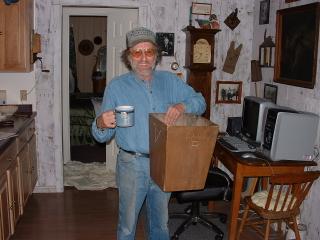 I stopped to take a pic and Frank continued - he usually waits for me somewhere down the road. This time Frank had stopped at a small store and we went inside. We met and chatted with owner Larry Duprey, a very friendly, interesting man. He is a collector of Roy Rogers memorbilia. This is a pic of Larry holding Roy's coffee cup and a handmade wastebasket made from left over wood from Roy's house. I also made friends with Larry's pet buffalo.