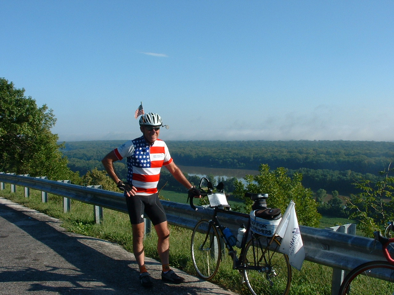 He has significant injuries but ones that will heal. He was taken by ambulance to a hospital here in St. Louis (St. Charles is a suburb of St. Louis) where he will be for 3 or 4 days. He has chest injuries, is in a lot of discomfort and is receiving pain medication. Sadly, he is unable to continue the ride and will be going home later this week. I went to the hospital this morning to visit him with our friends Craig Fulmer, Keith Hamsher, and ride leaders Mike and Barbara Monk. I especially will miss Frank's humor and wit. Considering what has happened, it was good see him in such good spirits. He is such a strong willed, intelligent man and warmly touches all who meet him. We met in 2002 and became roommates when I did a partial cross country ride (Sioux Fall, SD to Niagara Falls, NY). We enjoy each other's company and get along great. He will be missed on the ride and we all wish him a full and speedy recovery.