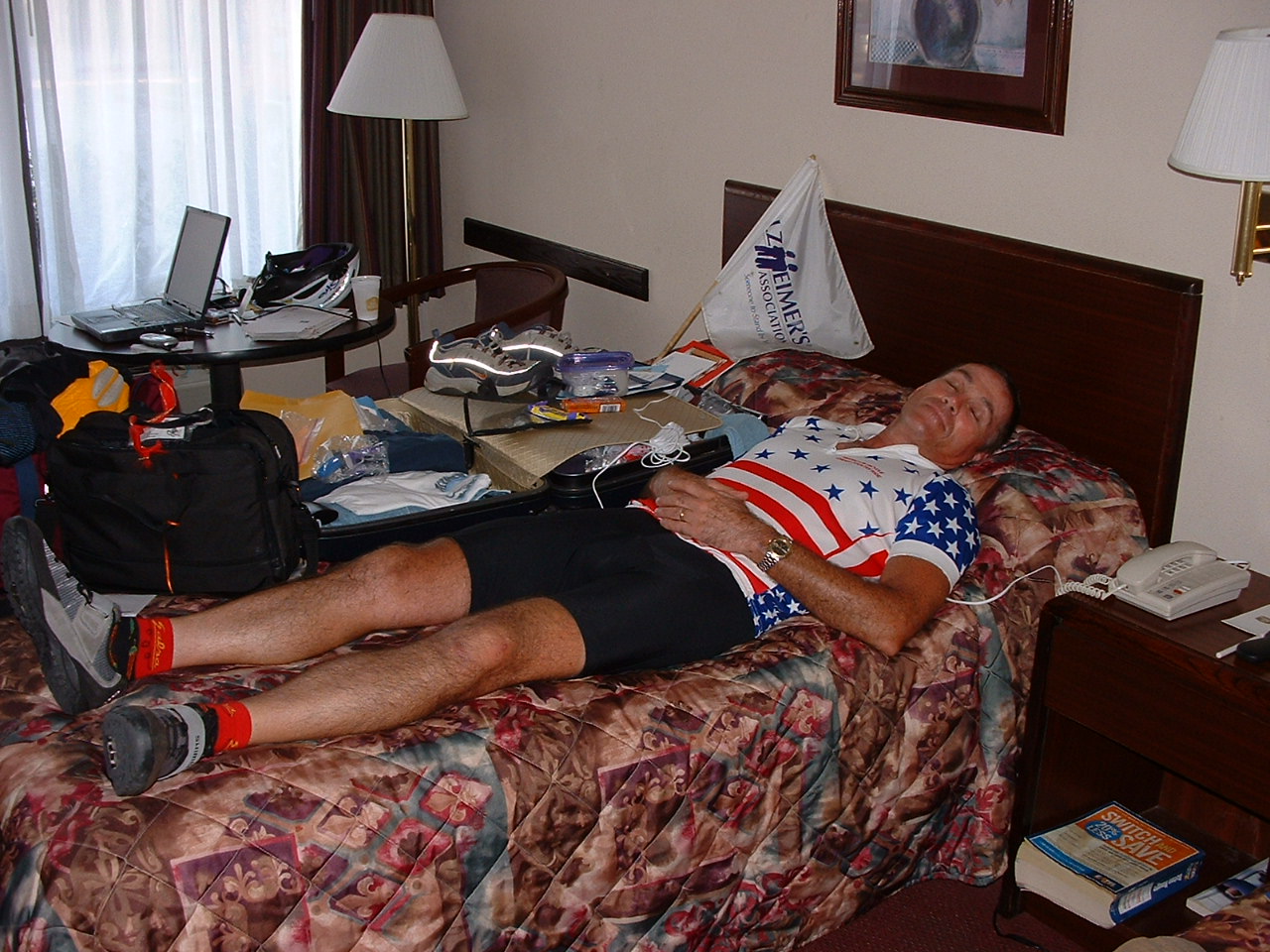 I've had a great trip and enjoyed this group of cyclists (34) more than any ride I've done. Some of you may wonder "how does he do it?" Well, I wonder that same thing myself sometimes. I am tired and will be glad to get home. Today when I arrived at our hotel, I went into the luncheonete room to watch the weather channel and fell asleep sitting up in a chair. We were supposed to have a formal banquet tomorrow night in Gonzales. Tonight we had pizza at the hotel and it turned into an informal sharing session by all - we expressed our feelings about the ride and there was a lot of "ribbing" and story telling. This is one of the things that we would do at the banquet - it was fun. I have had a lot of contacts with local people everywhere I've been and shared whenever I could - Alzheimer awareness and the information resource of my website. I feel fulfilled with this year's effort and that the donations people have made will help the Alzheimer's Association provide funds for research and support for services and programs for those on the front lines - the caregivers.