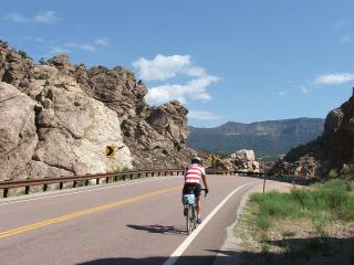 Great cycling weather again today, with just a chance of a thunderstorm in late PM. Early start due to a long ride (95 miles). I did an extra 7 miles as most of us did a side trip to Royal Gorge in Canon City. The first 40 miles was a downhill through a winding canyon. As one can see from my pics, the scenery was spectacular. This was another soul inspiring experience. Winding turn after winding turn, each one was seemingly more beautiful than the last. I was riding with Neil today which resulted in a lot of stops for ordinary and sometimes creative picture taking. We both just love to soak up this experience substantially stronger than most cyclists. We had an opportunity to "shoot" some pics of some mountain goats just 40 feet away. After we both took some pics, Neil climbed up the side of the embankment into the rugged, scrub brush and cactus to get some more interesting pics of the goats and flowering cactus, so naturally I followed him. It was great fun! We soon continued and when we were at SAG 1, several river rafts came down the river rapids. It was so cool to watch! We continued on and at almost every turn we said "WOW, look at that! gotta stop!" George joined us and it just continued to be incredible.